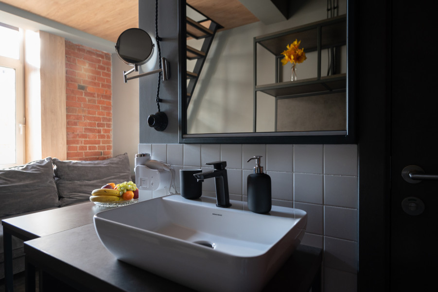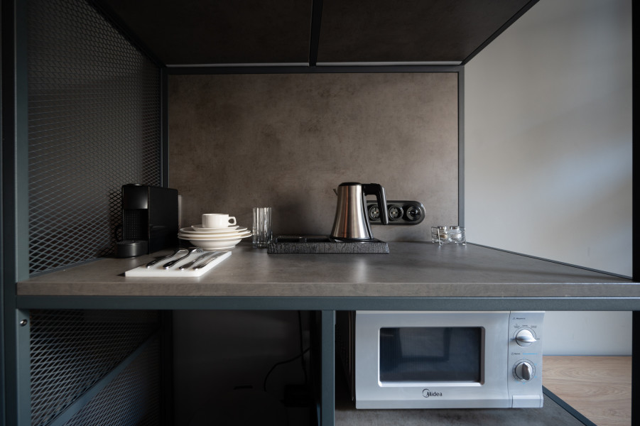 - Оборудование: кофемашина, микроволновая печь, мини-холодильник, набор посуды, телевизор, чайный набор посуды, электрочайник